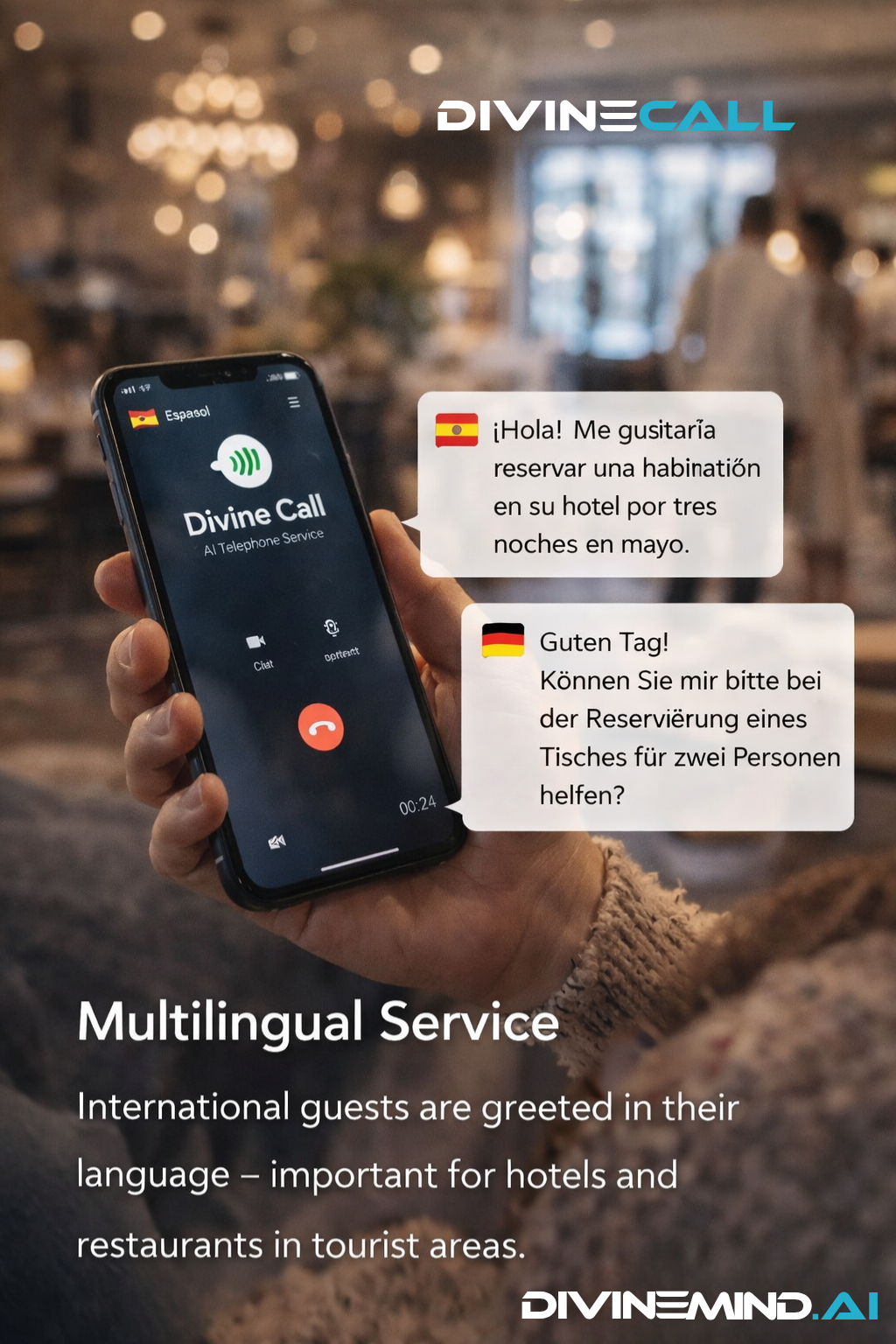 Vieraanvaraisuusalalla puhelin soi aina silloin, kun teillä ei ole aikaa – palvelun aikana, sisäänkirjautumisessa tai keittiössä. Samaan aikaan vieraat odottavat välitöntä tavoitettavuutta. Divine Call ottaa jokaisen puhelun vastaan, ottaa vastaan varauksia ja vastaa kysymyksiin aukioloajoista, ruokalistasta ja saatavuudesta.