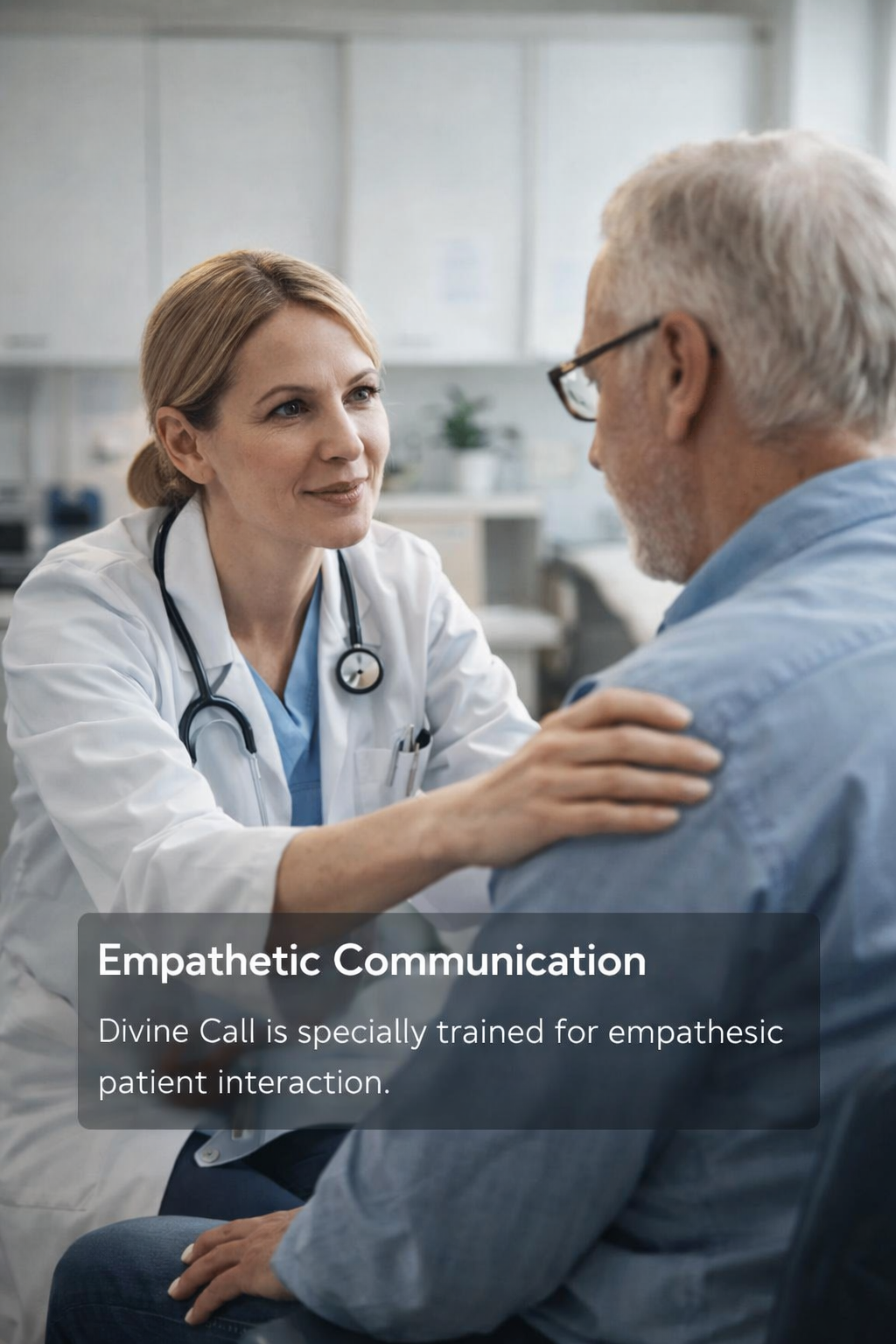 Divine Call is speciaal getraind in empathische omgang met patiënten — vriendelijk, begripvol en professioneel.
